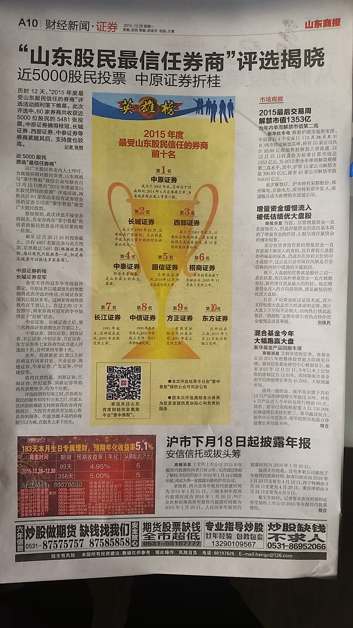 日前,济南营业部参加了山东商报组织的“山东股民最信任券商”评选,我部积极联系客户投票参与,在投票中取得第一的成绩,为公司赢得荣誉,也扩大了中原证券在山东地区的影响力。